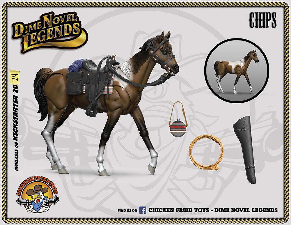 This paint horse comes complete with all the gear (saddle, canteen, bridle, lariat, rifle scabbard, and stand) that you might need. The horse is articulated at the upper neck, lower neck, tail, hips (flank), and knees for a great range of poses, and is designed specifically to work with our human figures.